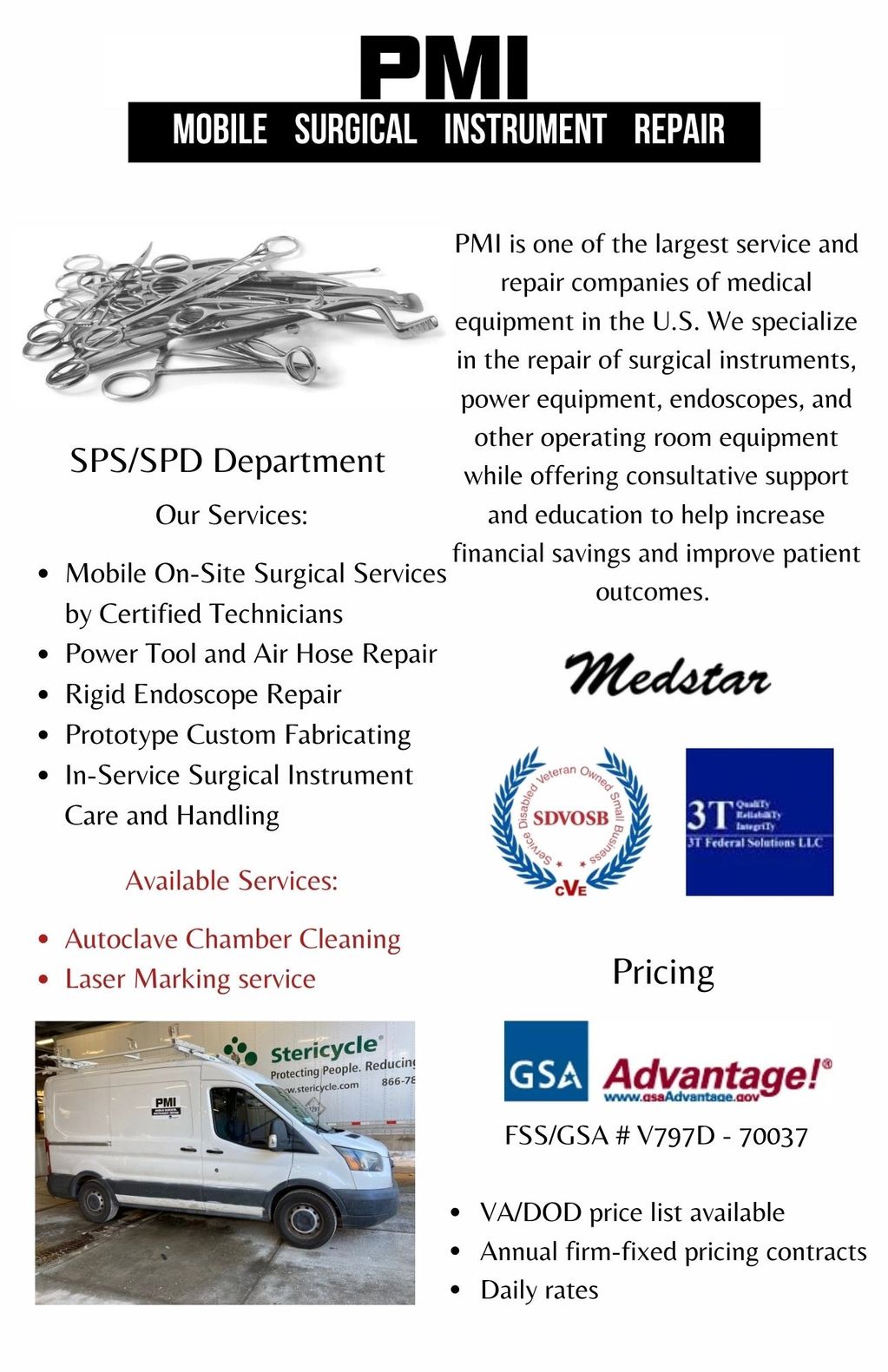 In addition, PMI repair technicians are CCSVP (Certified Central Service Vendor Partner) certified through IAHCSMM (International Association of Healthcare Central Service and Materials Management), ASQ CQI certified through the American Society of Quality, SSCS (Steam Systems Cleaning Specialist) certified through Steris and are certified in Blood Borne Pathogens and Operating Room Protocol.